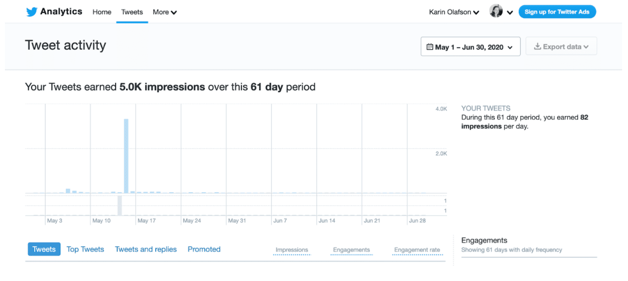 Tracking social media KPIs natively — meaning, using the built-in analytics features of individual social media platforms — is one option. They’re free, easy to use and can be a good option for social media managers who are only tracking KPIs for one or two social accounts.