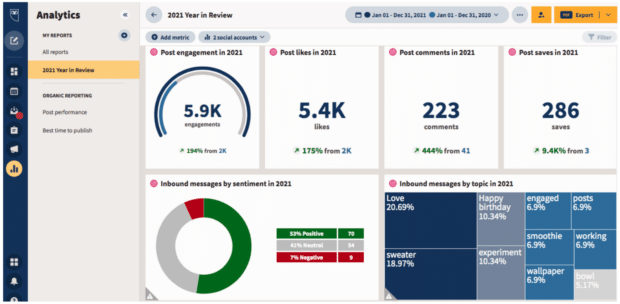 Hootsuite Insights helps you understand conversations happening around your brand. It allows you to gauge sentiments, reply to comments in real-time, and follow key trends. Save time by setting up automatic reports that you can share with your entire company.