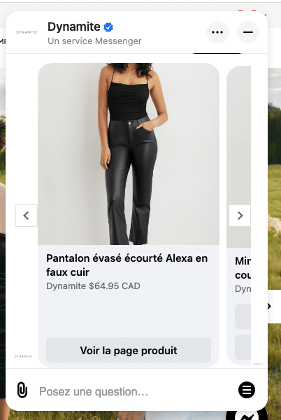 Chatbot on Dynamite’s website showing options for black pants in French.