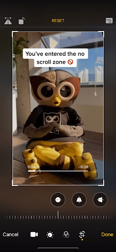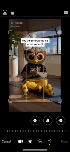 - Pinch and zoom to edit the dimensions of the video, cropping out the watermark. Because the watermark bounces around, you’ll need to crop more than one area of your video.