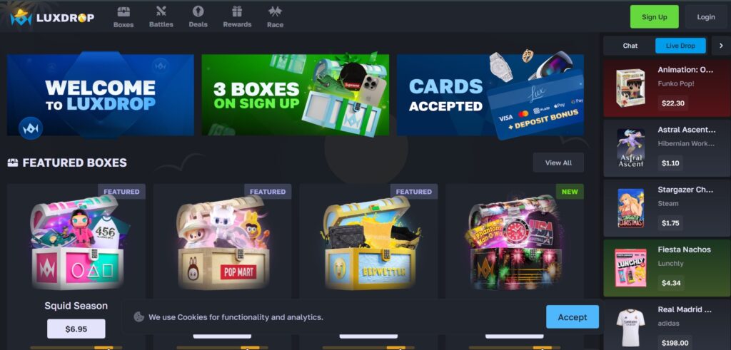 LuxDrop has carved out a solid position in the mystery box market through its focus on high-end fashion and streetwear from brands like Supreme, Off-White, and Balenciaga. The site covers boxes from budget-friendly to premium, claims to use a provably fair system, and has multiple payment options, including crypto. However, several aspects fall short compared to industry leaders like JemLit, including a dated, confusing interface that’s well behind JemLit’s modern design, shipping times that stretch beyond two weeks, and much tardier customer service response times.