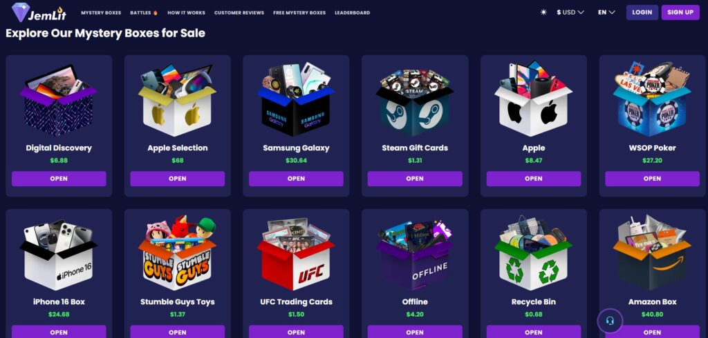 JemLit stands as one of the most transparent and trustworthy platforms in the mystery box industry, boasting over 600 reviews on Trustpilot and maintaining a near-perfect rating that places it among the best mystery box websites. The platform’s clean interface sets it apart from competitors that focus on hype and cluttered graphics, with a helpful search function on the landing page that lets you immediately whittle down the huge selection to boxes you’re interested in, such as Apple, plus multi-currency support and language-switching for global users. Those things might sound normal, but most other mystery box sites don’t offer them.