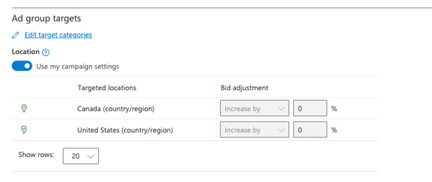 You can also retarget your ads after the fact using Bing ads editor. To do that, simply head to your campaign or ad group’s Settings. Then, look for the Campaign targets or Ad group targets section and click Edit target categories. This will bring you to the same place as above, where you can edit and adjust based on company, industry, and job function.