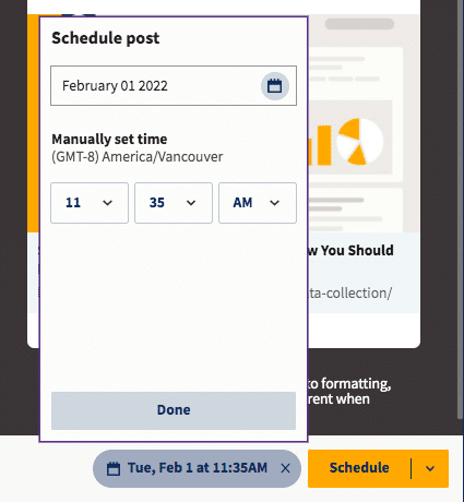 - When you’re happy with the preview, click Schedule for later, then enter the date and time at which you want your post to publish. Click Done and then Schedule to queue up the post.