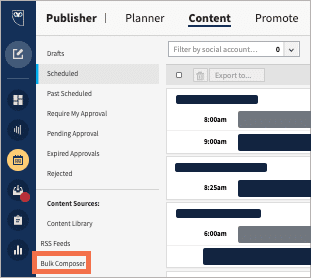 - From the Hootsuite dashboard, go to Publisher and then click the Content tab in the top menu. Click Bulk Composer under Content Sources.