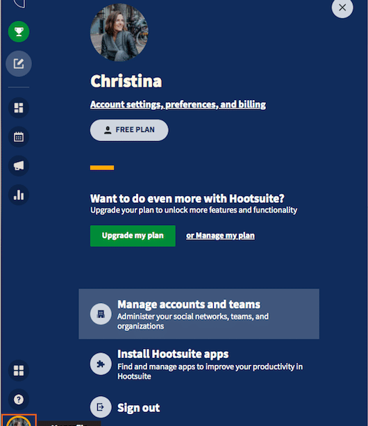 - In the Hootsuite dashboard, click your profile photo (My profile), then click Manage accounts and teams.