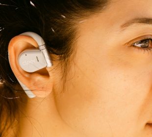 Cleer Audio ARC wireless earbuds has an earhook flexible hinge design for a secure fit ...
