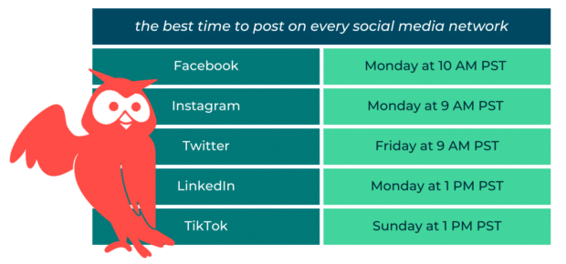 Generally, the best time to post on social media overall is 9:00 AM PST (12:00 PM EST) on Mondays. But every network has its own sweet spot.