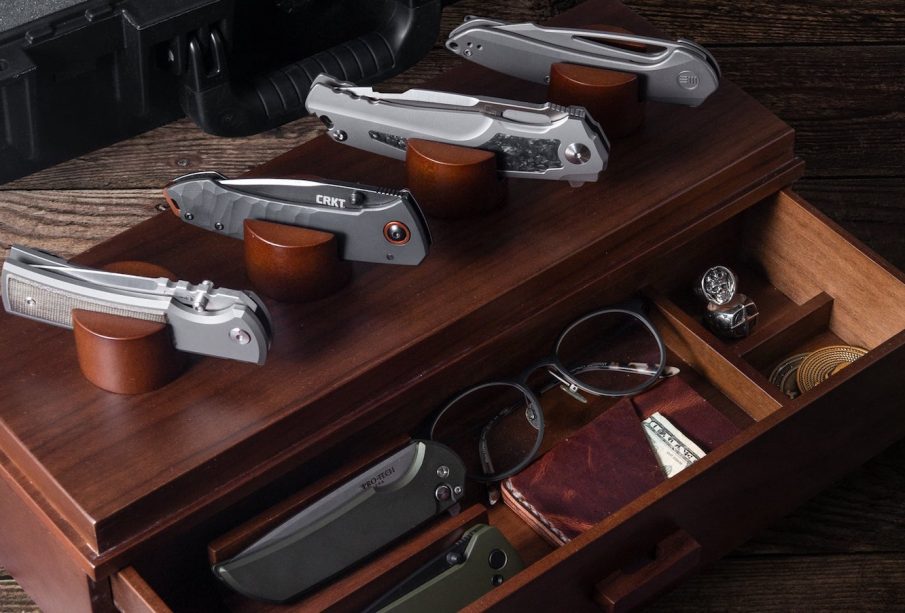 Display up to 6 knives on your desk or at home with the Holme & Hadfield Knife Deck. This organizer includes a shelf and a spacious drawer, so you can rotate your favorite knives and store larger ones out of the way. In fact, the drawer includes separate compartments to store additional accessories such as coins, rings, and knife tools. Simply add your knives to the secure holders, and store your collection with pride. Best of all, there’s no unnecessary locking system. All the while, thanks to the transparent casing, you can see your knives while keeping them out of the way. Finally, the Holme & Hadfield Knife Deck—which is available in black and walnut—holds knives with a 1-inch width and 5.5-inch length, making it highly versatile.