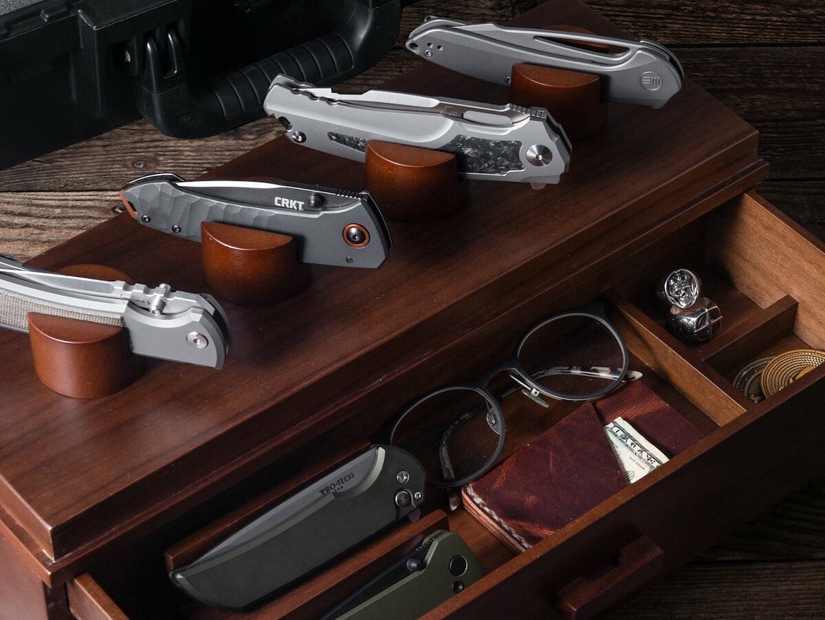 Display up to 6 knives on your desk or at home with the Holme & Hadfield Knife Deck. This organizer includes a shelf and a spacious drawer, so you can rotate your favorite knives and store larger ones out of the way. In fact, the drawer includes separate compartments to store additional accessories such as coins, rings, and knife tools. Simply add your knives to the secure holders, and store your collection with pride. Best of all, there’s no unnecessary locking system. All the while, thanks to the transparent casing, you can see your knives while keeping them out of the way. Finally, the Holme & Hadfield Knife Deck—which is available in black and walnut—holds knives with a 1-inch width and 5.5-inch length, making it highly versatile.