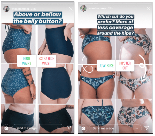 Swimwear company Mimi Hammer knows that how a swimsuit fits is the most important factor influencing their customers’ buying decisions. They do a good job of asking yes/no questions with visual examples that are easy for followers to answer quickly, increasing the likelihood that people will.