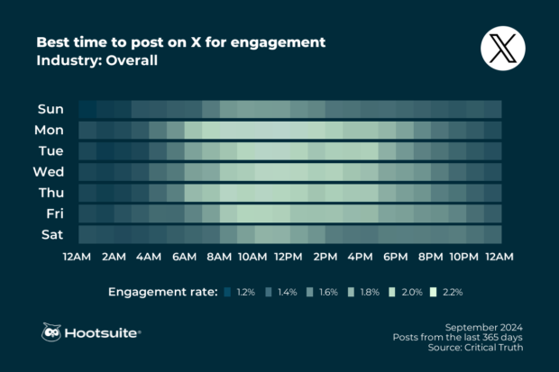 Our research found X posts get the most engagement during business hours, with a peak between 10am-1pm on weekdays.