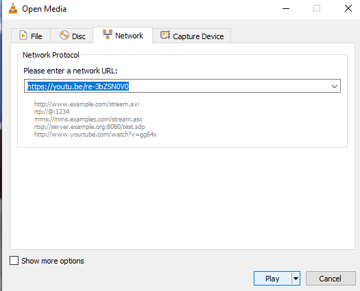 Step 5: In the pop-up that appears, select the Network tab and paste the YouTube video’s URL in the text box at the top, and then click Play at the bottom