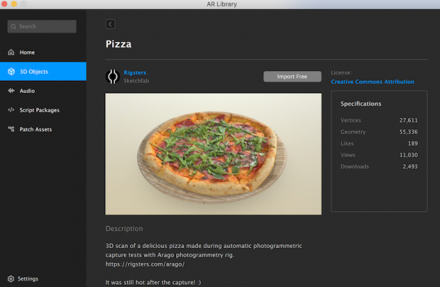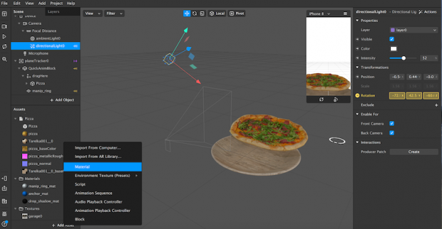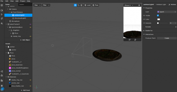 Now, you’ll see your uploaded asset—in our case, a rotating pizza—in the Viewport. Using the Scene panel, edit how it looks, moves and interacts with the real-world. The edits will result in your custom AR filter.