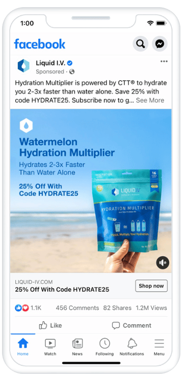 Liquid I.V., an electrolyte drink mix, used Custom Audiences for people who had purchased in the past, added an item to their shopping cart, or engaged on social media.