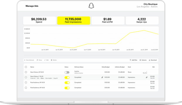 The Manage Ads tab in Ads Manager shows you how well your Snap Ads are performing based on your chosen metrics. This tab is also how to see daily spend in Snapchat Ad Manager.
