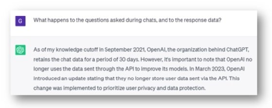 Furthermore, chat data captured before March 2023 was subject to a 30-day retention policy. Note: OpenAI’s data usage and retention policies should be studied as part of a proper cyber risk assessment rather than depending on an answer from ChatGPT.