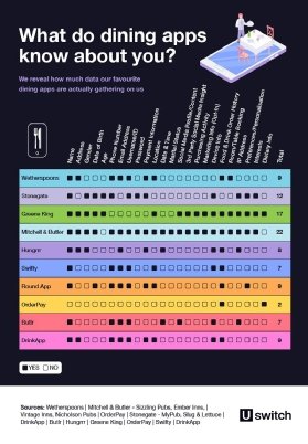 The most privacy-conscious app, according to Uswitch’s data, is OrderPay, which requests just two data points from users, their food and drink order history, and dietary requirements. OrderPay is used at a number of chains, including Be At One, Bierkeller, Bar Soho and Giggling Squid.