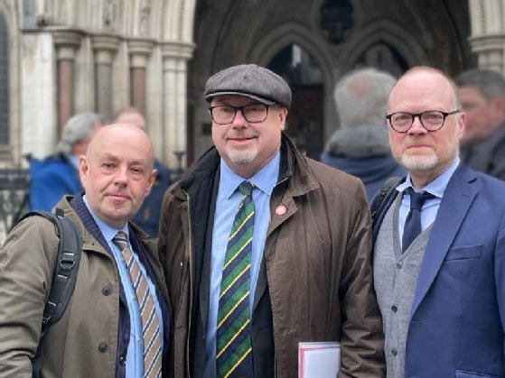 L-R: Barry McCaffrey, Grahame Morris MP and Trevor Birney outside court