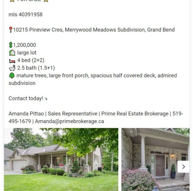 The agent included all their contact details so viewers don’t have to click away to find her number. There’s a carousel of professional images. Plus the “Learn more” button leads to a form shoppers can use to give their email addresses and phone number.