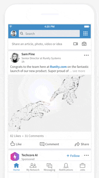 Sponsored Content, also known as native ads, show up your audiences’ LinkedIn feed, regardless of whether they’re scrolling on mobile or their desktop. LinkedIn labels these ads as “promoted” to distinguish them from regular content.