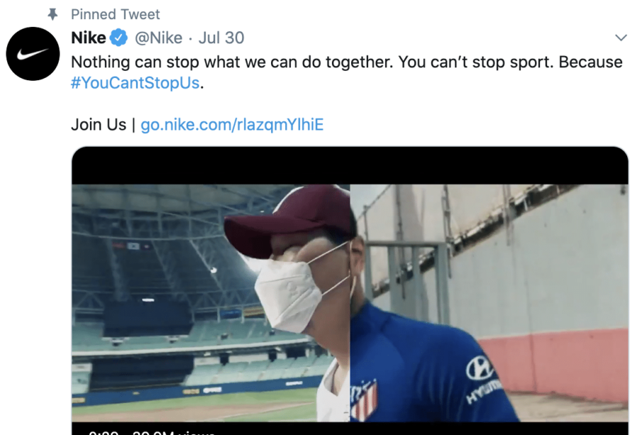 For example, Nike uses its logo for its Twitter profile picture. It uses its slogan for the header photo. Nike’s latest ad campaign, “You Can’t Stop Us,” is pinned so it is always easily visible to users visiting Nike’s account: