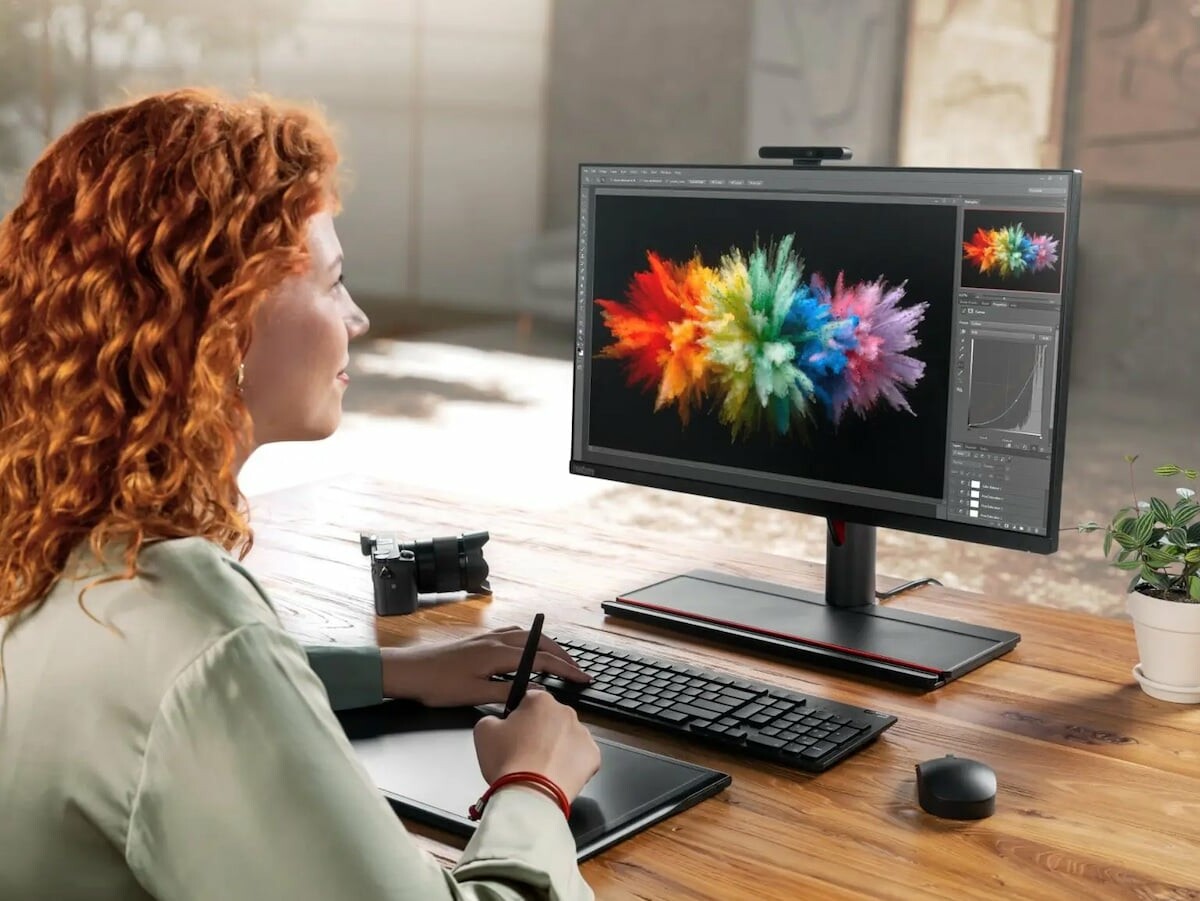 Elevate your workflow when you have the Lenovo ThinkCentre M90a Pro Gen 4. This desktop computer for content creators and workplaces has an impressive 27-inch QHD display.
