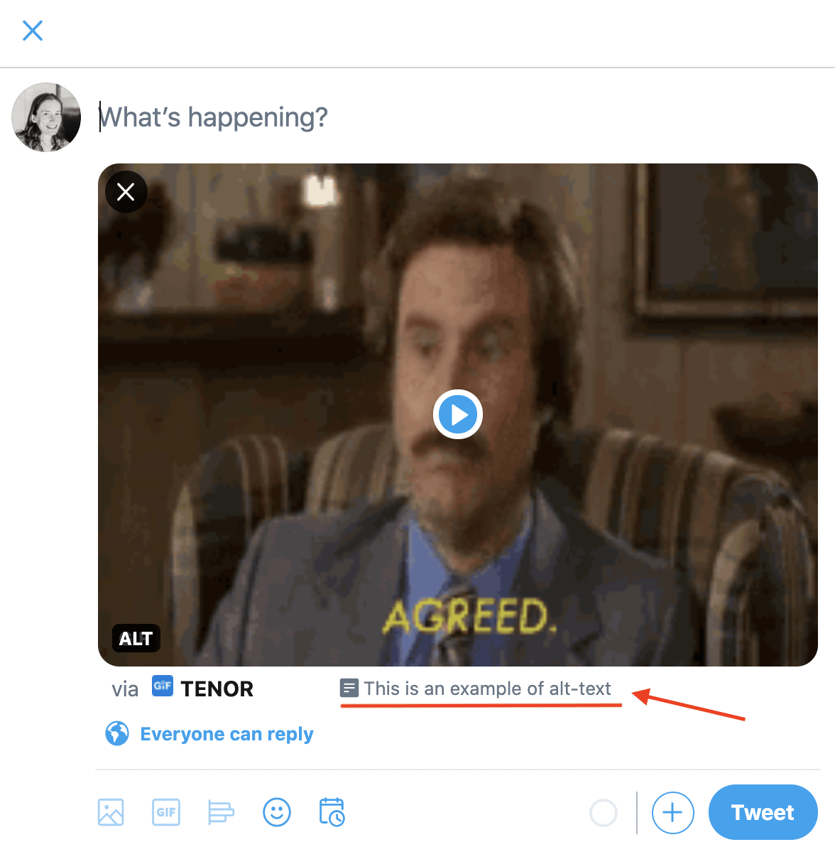 If you’re not sure what this means, know that alt text is simply a written description. Alt text explains what is happening in the GIF or image. This makes your Tweet’s visuals more accessible and helps all users understand the context, particularly users who are visually impaired.