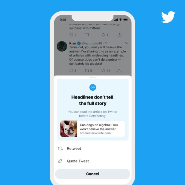 Sharing an article with a Retweet or Quote Tweet? If you haven’t already read the article, we may ask if you’d like to open it first. pic.twitter.com/eFrZcoUjWC