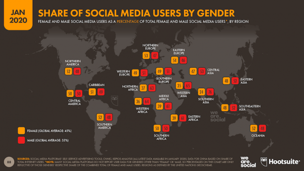 The digital gender gap is apparent in our latest social media data too. Women in Southern Asia are three times less likely to use social media today compared to men. And on average, 55% of men use social media compared to 45% of women.