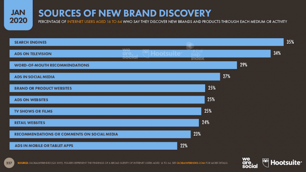 Overall, GlobalWebIndex reports that search engines are the primary source of discovery for new brands and products, slightly ahead of television adverts. But, younger users are more likely to turn to social media when they’re actively researching brands and products.