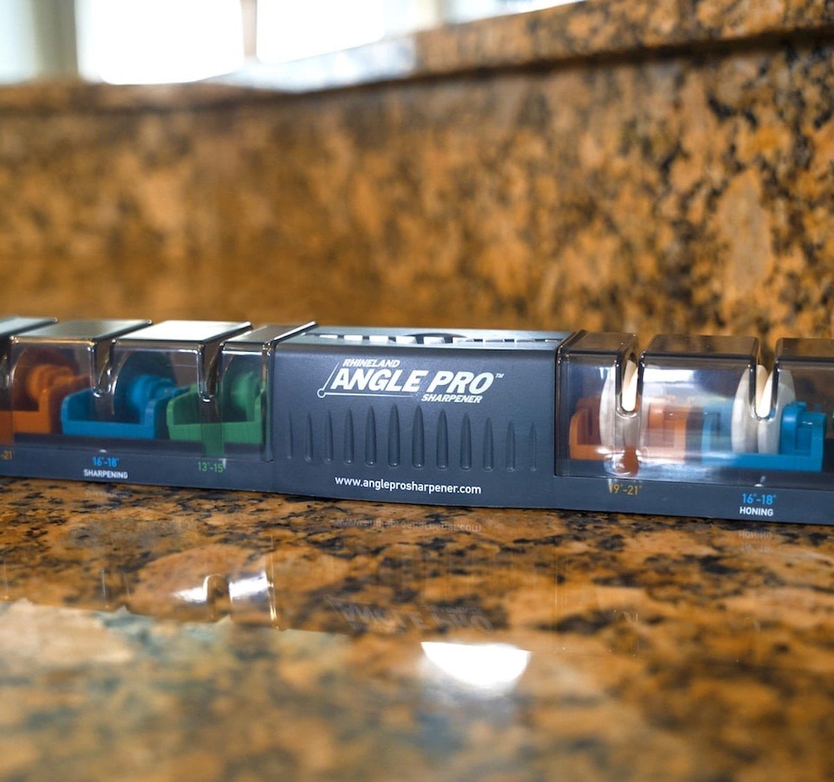 Dull knives lead to more kitchen accidents. That’s because, with a dull knife, you need to make more cuts to get the same results as you would from one that’s razer-sharp. And a sharp knife also cuts more cleanly and reduces your chances of slips while cutting. So to keep your fingers safe while you’re chopping up those fine herbs and deboning a chicken, you want to be sure your knives are always in top condition. And the Rhineland Angle Pro Blade Sharpener is a great tool for the job.