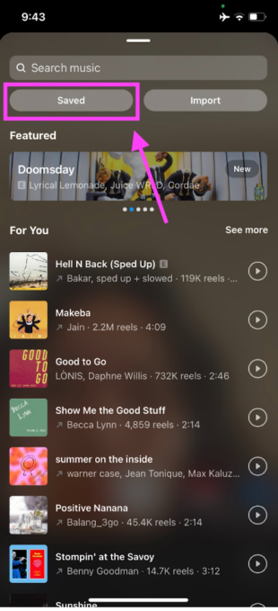 To access the audio that you’ve saved, just go to Saved on the audio page when you’re posting your Reel. Or, go to your saved posts (instructions for how to access those are under “How to save an Instagram Reel with audio” later in this blog post).