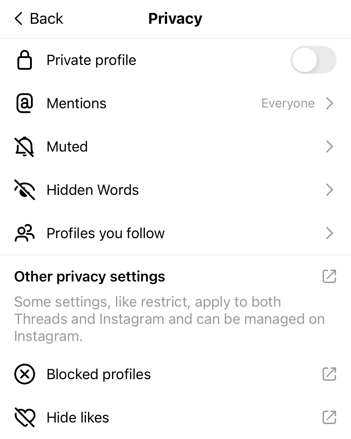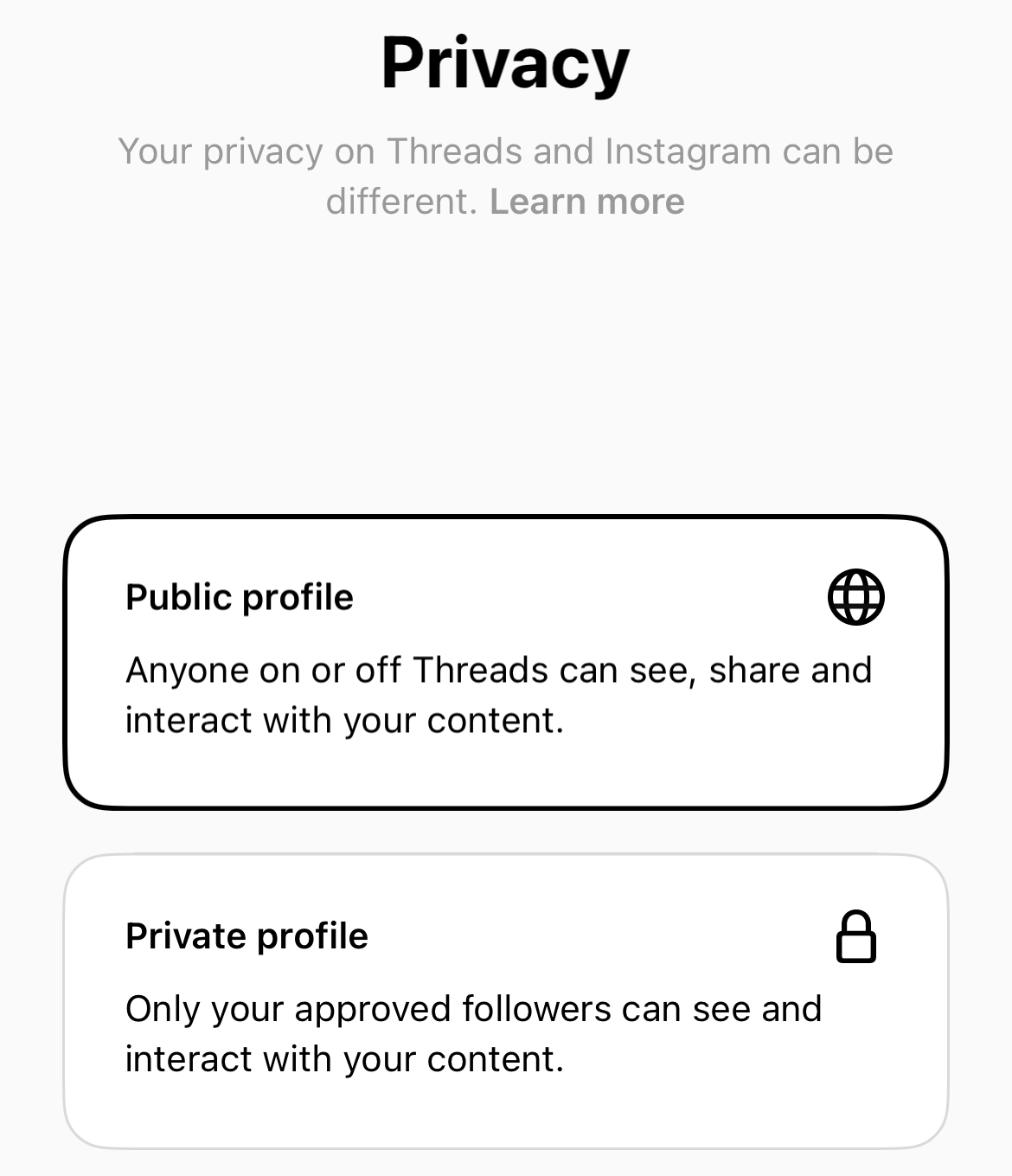 - Public profile. Anyone on or off Threads can see, share and interact with your content.