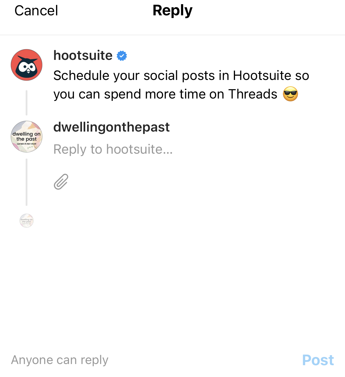 - A quote bubble to reply directly to the thread. (On Instagram, tapping this icon opens the comment section.)