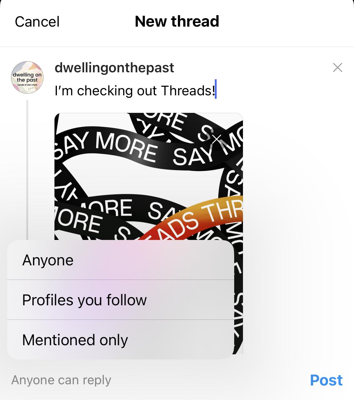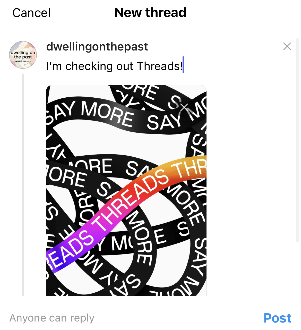 Then, select the image you want and it will appear in your Thread draft. Click the X in the right-hand corner of the photo to remove it, or click Post to publish your Thread.