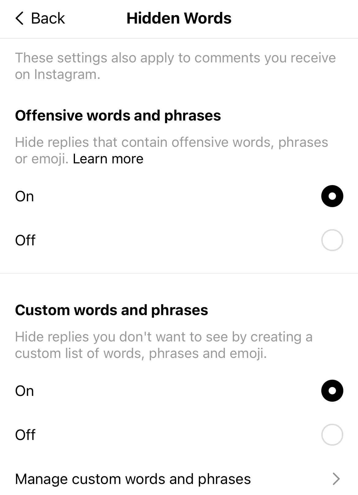 You can also manage your hidden words here. This includes offensive words and phrases as well as custom words. If you never want to hear about ice cream again, this is the place to do it!