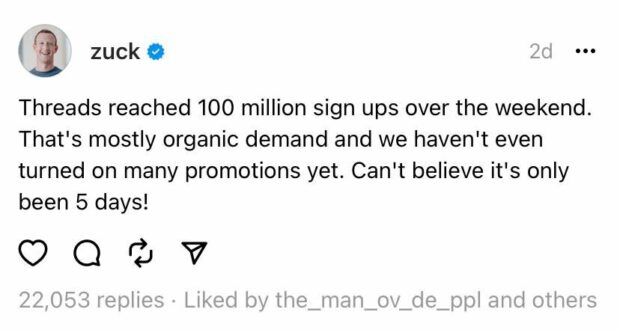 Threads crossed the 100 million user mark less than a week after its launch, making it the fastest-growing app in history.