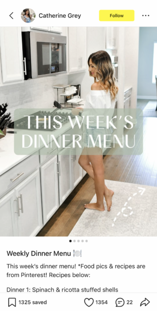 Come up with a topic for your photo carousel. The one above focuses on meal planning, with the creator sharing her planned menu for the week along with recipes and photos of each dish.