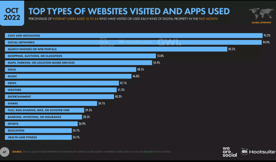 Social networks are the second-most-popular type of website or app, topped only by chat and messaging.
